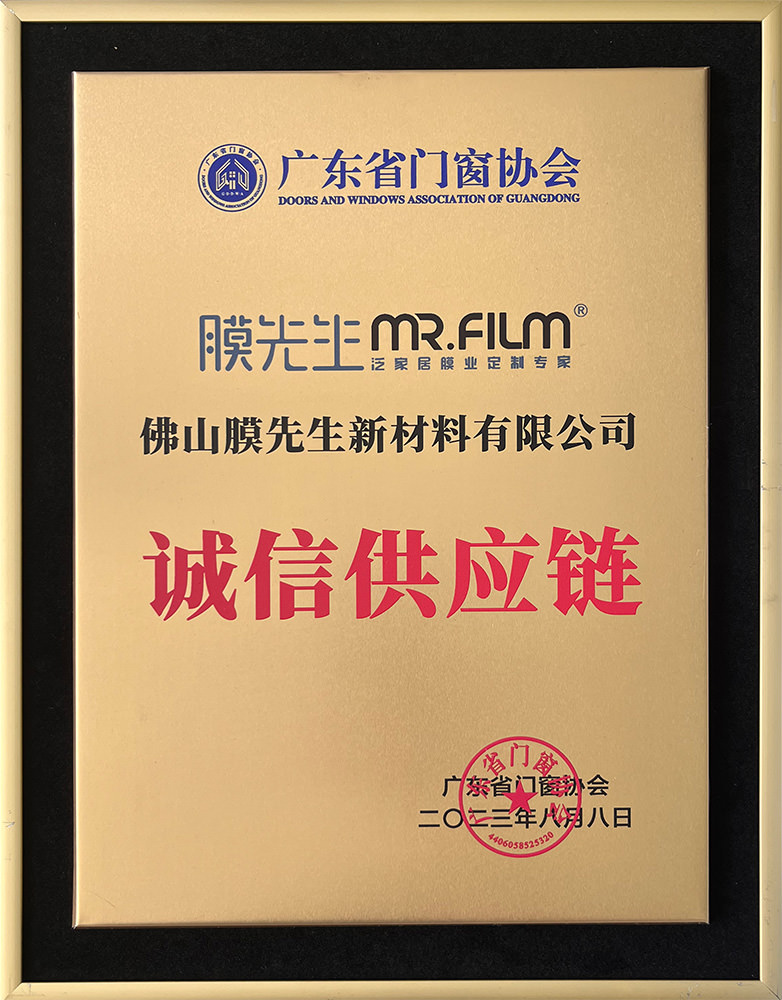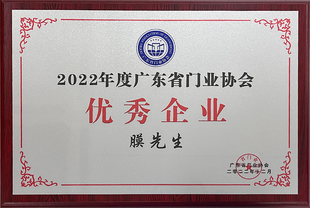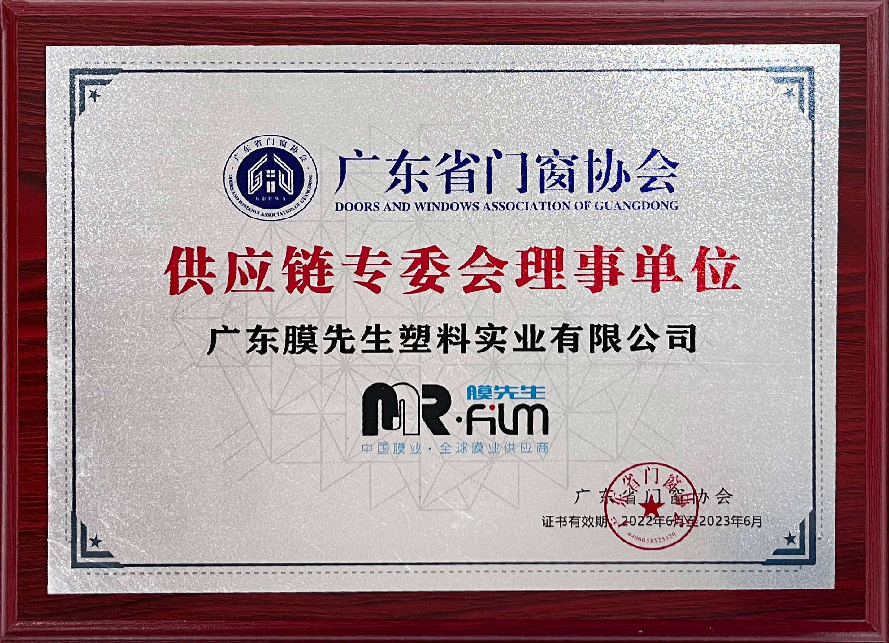 膜先生被評為廣東省門業(yè)協(xié)會優(yōu)秀企業(yè),榮膺廣東省門窗協(xié)會供應(yīng)鏈專委會理事單位。